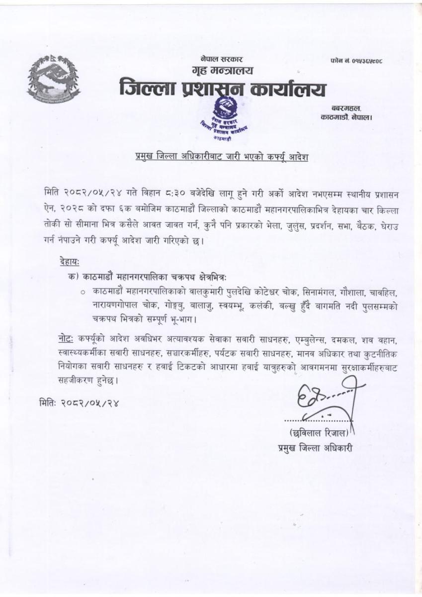 काठमाडौं । काठमाडौंमा कर्फ्यू आदेश जारी भएको छ । जिल्ला प्रशासन कार्यालय काठमाडौंले आज बिहान साढे ८ बजेदेखि अर्को आदेश नभएसम्म काठमाडौं महानगरको चक्रपथ क्षेत्र भित्र कर्फ्यू आदेश जारी गरेको हो ।