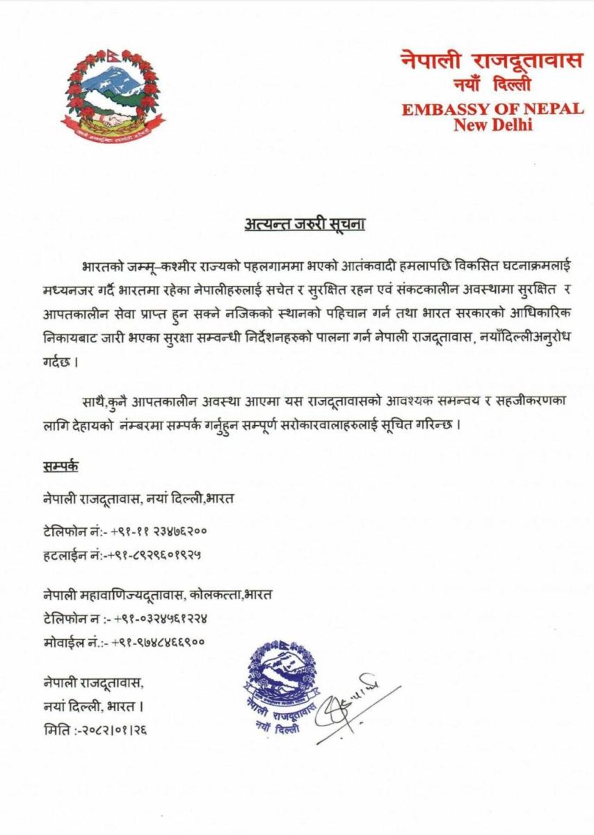‘भारतको जम्मू–कश्मीर राज्यको पहलगाममा भएको आतंकवादी हमलापछि विकसित घटनाक्रमलाई मध्यनजर गर्दै भारतमा रहेका नेपालीहरुलाई सचेत र सुरक्षित रहन एवं संकटकालीन अवस्थामा सुरक्षित र आपतकालीन सेवा प्राप्त हुन सक्ने नजिकको स्थानको पहिचान गर्न तथा भारत सरकारको आधिकारिक निकायबाट जारी भएका सुरक्षा सम्वन्धी निर्देशनहरुको पालना गर्न नेपाली राजदूतावास, नयाँ दिल्ली अनुरोध गर्दछ ।’ दूतावासको सूचनामा भनिएको छ ।