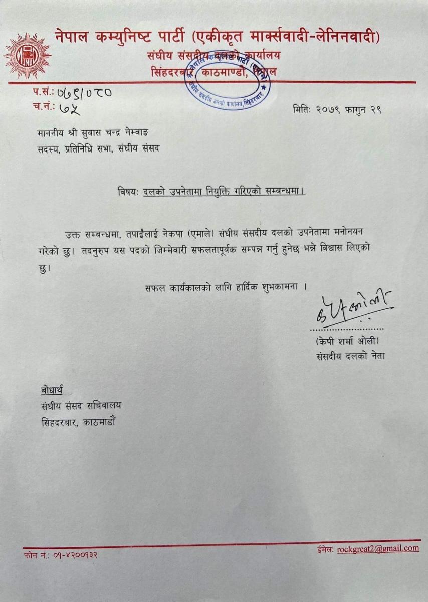 काठमाडौंं।नेकपा एमालेको संसदीय दलको उपनेतामा सुवासचन्द्र नेम्वाङ नियुक्त भएका छन्। एमाले अध्यक्ष तथा संसदीय दलका नेता केपी शर्मा ओलीले नेम्वाङलाई दलको उपनेता नियुक्त गरेका हुन् ।