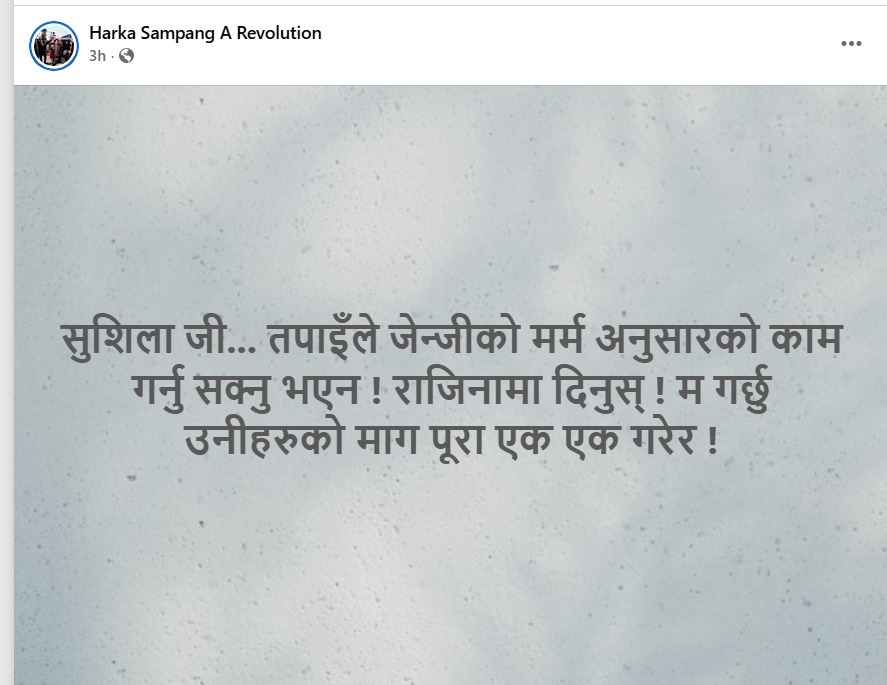 साम्पाङले भनेका छन् “सुशीला जी, तपाईंले जेनजीको मर्म अनुसारको काम गर्नु सक्नुभएन। राजीनामा दिनुस्। म गर्छु उनीहरूको माग पूरा, एक–एक गरेर।”