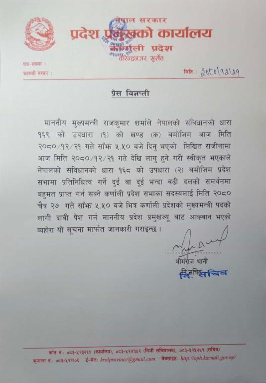 प्रदेश प्रमुख तिलक परियारले सात दिनको समय दिएर संविधानको धारा १६९ को उपधारा (१) को उपधारा (क) अनुसार चैत २७ गते बेलुका ५ः५० भित्र नयाँ सरकार गठन गर्न विज्ञप्ति जारी गर्दै आह्वान गरेका हुन्।