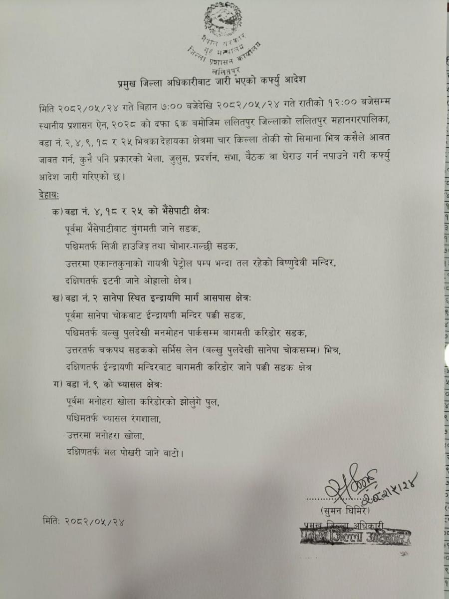 ललितपुरका विभिन्न तीन क्षेत्रमा मध्यरातिसम्म कर्फ्यू आदेश