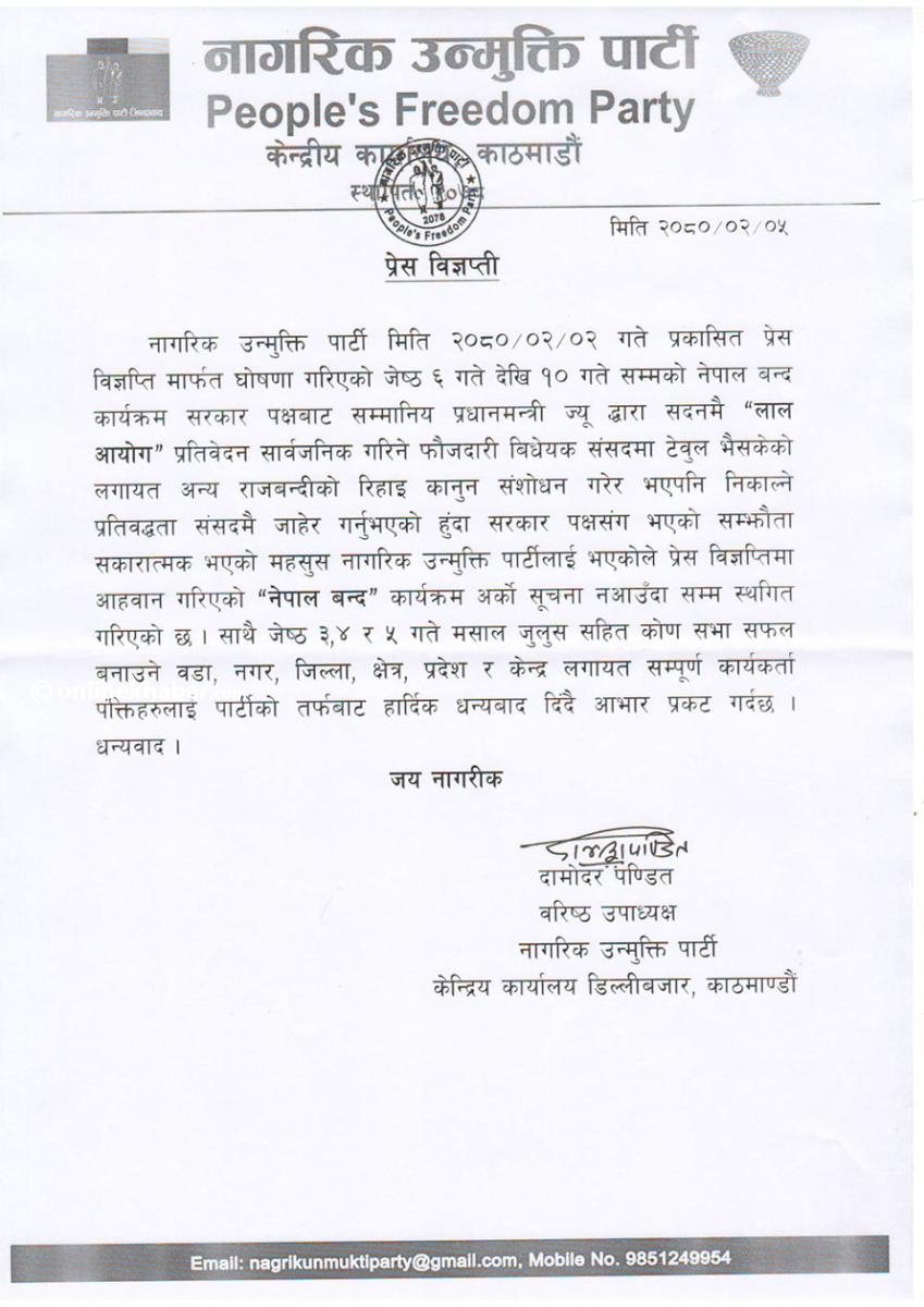 सरकार पक्षसँग भएको सम्झौता सारकारात्मक भएको महसुस नागरिक उन्मुक्ति पार्टीलाई भएकाले प्रेस विज्ञप्तिमा आह्वान गरिएको नेपाल बन्द कार्यक्रम अर्को सूचना नआउँदासम्म स्थगित गरिएको एक नेताले बताए।