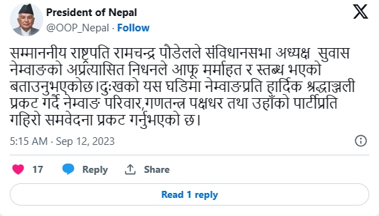 पौडेलले ट्वीटमा लेखेका छन् ‘संविधानसभा अध्यक्ष सुवास नेम्वाङको अप्रत्यासित निधनले आफू मर्माहत र स्तब्ध बनाएको छ ।’उनले नेम्वाङप्रति श्रद्धाञ्जली प्रकट गर्दै परिवारप्रति गहिरो समवेदना व्यक्त गरेका छन् ।