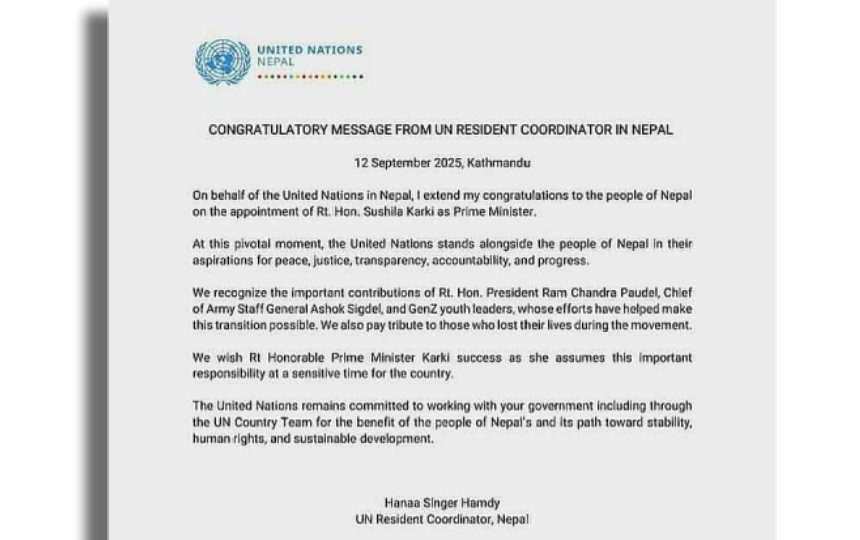 प्रधानमन्त्री कार्कीलाई ‘देशको संवेदनशील अवस्थामा यो महत्वपूर्ण जिम्मेवारी सम्हाल्दै हुनुहुन्छ, उहाँलाई सफल कार्यकालको शुभकामना व्यक्त गर्दछौं,’ भन्दै शुभेच्छा व्यक्त गरिएको छ । संयुक्त राष्ट्रसंघले नेपालको स्थायित्व, मानव अधिकार र दिगो विकासको यात्रामा सरकारसँग सहकार्य गर्दै अगाडि बढ्ने प्रतिबद्धता दोहोर्‍याएको छ ।