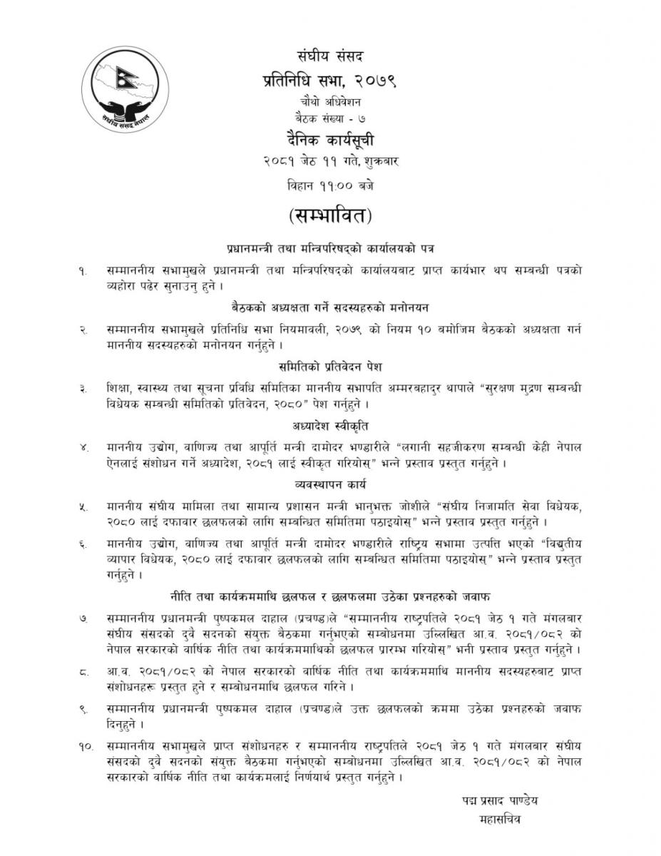 त्यसैगरी सरकारको वार्षिक नीति तथा कार्यक्रममाथि सांसदहरूबाट प्राप्त संशोधनहरू प्रस्तुत हुने र छलफल गर्ने कार्यसूची पनि छ। त्यसपछि प्रधानमन्त्री प्रचण्डले छलफलका क्रममा उठेका प्रश्नहरूको जवाफ दिनेछन्।