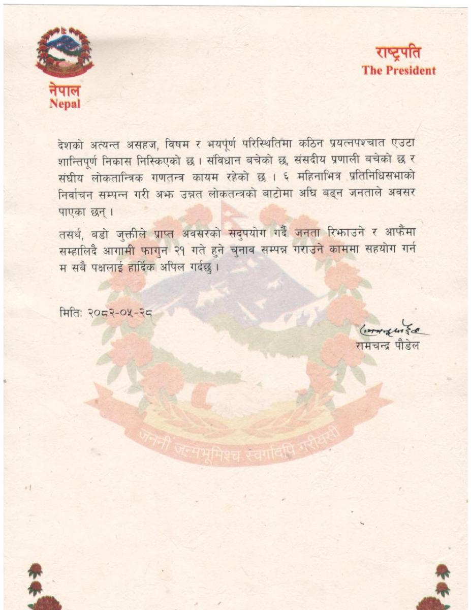 राष्ट्रपति पौडेलले शनिबार वक्तव्य जारी गरी बडो जुक्तीले प्राप्त अवसरको सदुपयोग गर्दै जनता रिझाउने र आफैंमा सम्हालिँदै आगामी फागुनका लागि तोकिएको चुनाव सम्पन्न गराउन सबै पक्षलाई अपिल गरेका हुन् ।