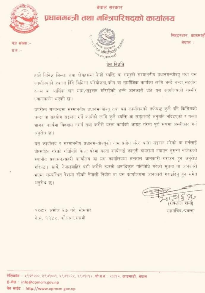 प्रधानमन्त्रीको नाम प्रयोग गरेर चन्दा संकलन गरेको वा गर्नलाई प्रोत्साहित गरेको गतिवधि फेला पारेमा यस्ता कार्यलाई कानुनी दायरामा ल्याउन स्थानीय प्रहरीलाई खबर गरिदिन विज्ञप्तिमा आग्रह गरिएको छ ।