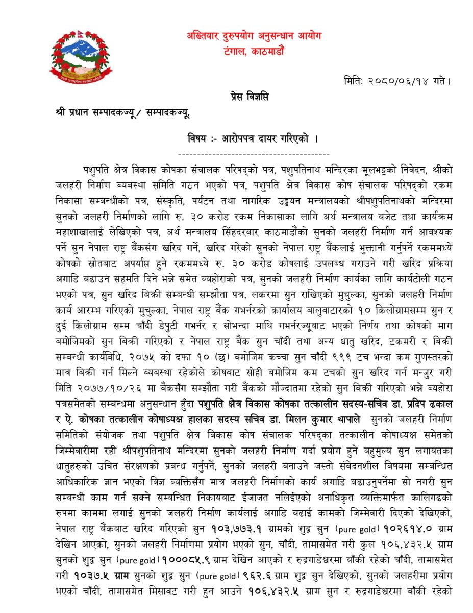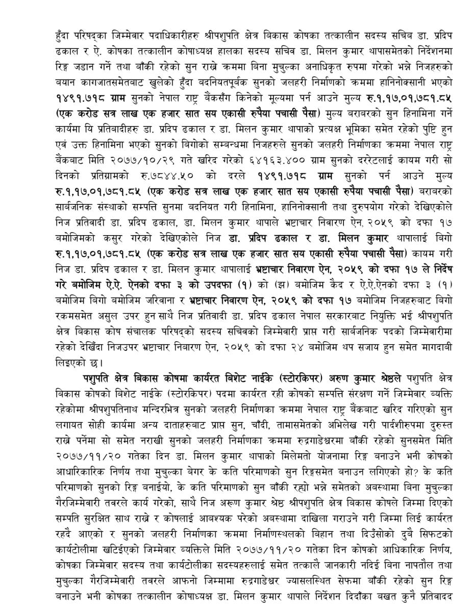 आयोगले जलहरी राख्ने क्रममा एक किलो ४९१.७१८ ग्राम सुन हिनामिना गरेको भन्दै त्यसबापतको एक करोड १७ लाख १ हजार ७८१ रुपैयाँ ८५ पैसा भ्रष्टाचार गरेको आरोप लगाएको हो । पशुपति क्षेत्र विकास कोषका तत्कालीन सदस्य सचिव ढकाल र कोषाध्यक्ष थापाविरुद्ध भ्रष्टाचारको मुद्दा दायर गरेको अख्तियारका प्रवक्ता भोला दाहालले जानकारी दिनुभयो ।