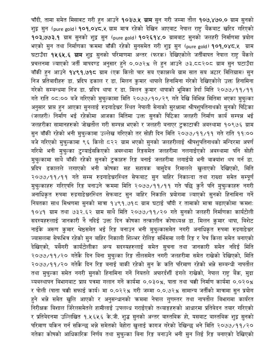 अख्तियारले विशेष अदालतमा दायर गरेको आरोप पत्रअनुसार तत्कालीन सदस्यसचिव ढकाल र हालका सदस्यसचिव थापाले मिलोमतोमा १ किलो ४९१.७१८ ग्राम सुनको ठाउँमा चाँदी र तामा मिसाएर हिनामिना गरेको अख्तियारले दाबी गरेको छ ।