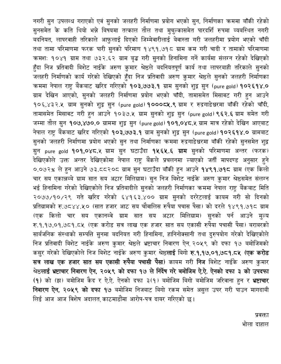 अख्तियारको आज प्रेस विज्ञप्ति जारी गरि अदालतमा दायर गरेको आरोप पत्रमा भनिएको छ।