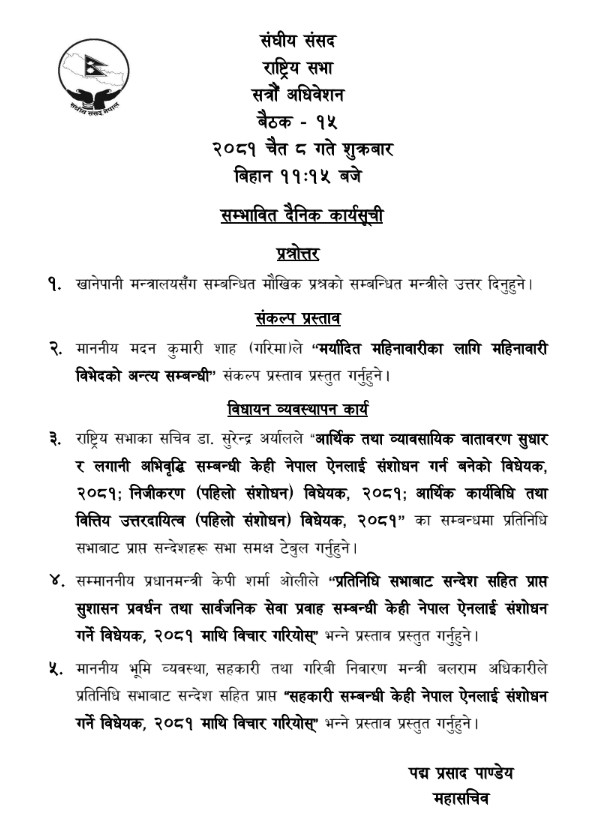 बैठकमा खानेपानी मन्त्रालयसँग सम्बन्धित मौखिक प्रश्नको सम्बन्धित मन्त्रीले उत्तर दिने सम्भावित कार्यसूची छ । यस्तै, राष्ट्रियसभा सदस्य मदनकुमारी शाह (गरिमा)ले ‘मर्यादित महिनावारीका लागि महिनावारी विभेदको अन्त्यसम्बन्धी’ संकल्प प्रस्ताव प्रस्तुत गर्नेछिन् ।