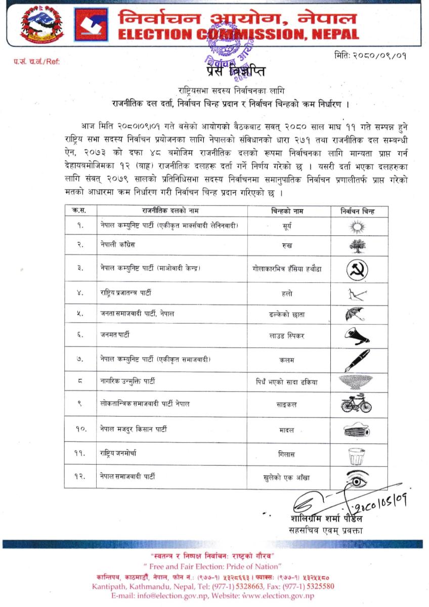 राष्ट्रिय सभा निर्वाचन; राष्ट्रिय सभा निर्वाचनमा १२ वटा राजनीतिक दलहरुले निर्वाचन चिन्ह पाए