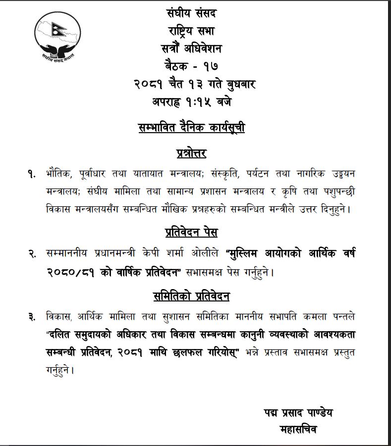 बैठकमा प्रधानमन्त्री केपी शर्मा ओलीले ‘मुस्लिम आयोगको आर्थिक बर्ष २०८०/८१ को बार्षिक प्रतिबेदन’ सभासमक्षा पेश गर्नेछन् भने विकास, आर्थिक मामिला तथा सुशासन समितिका सभापति कमला पन्तले ‘दलित समुदायको अधिकार तथा विकास सबन्धमा कानुनी ब्यवस्था आवाश्यक्ता सबन्धी प्रतिबेदन, २०८१ माथि छलफल गरियोस्’ भन्ने प्रस्ताव प्रस्तुत गर्ने सम्भावित कार्यसुचीमा उल्लेख गरिएको छ ।