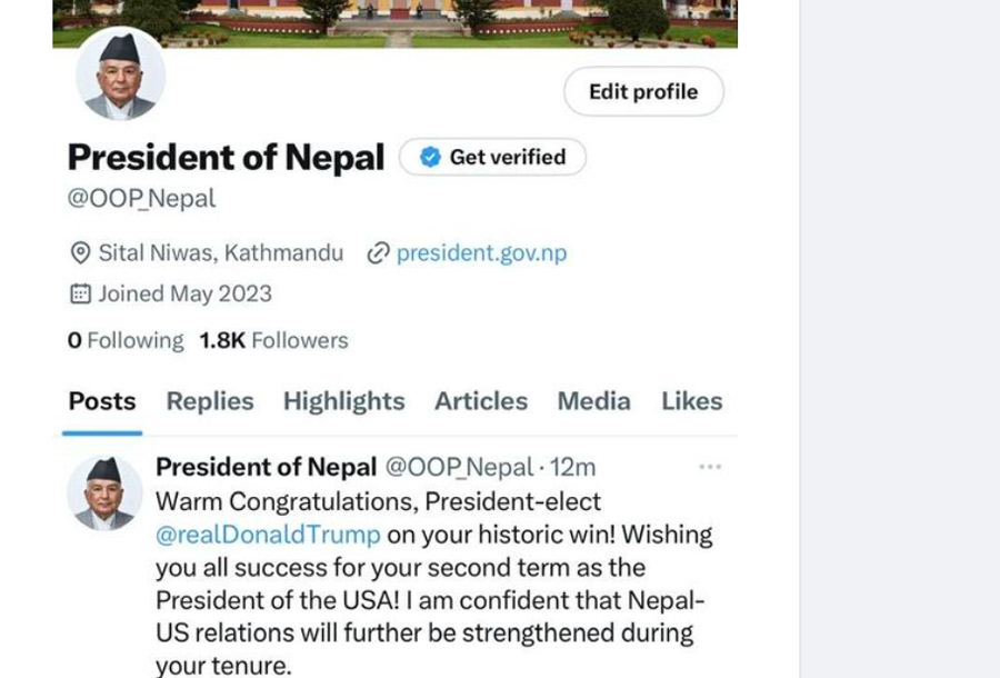 राष्ट्रपति पौडेलले आज सामाजिक सञ्जाल एक्समार्फत ऐतिहासिक जित हासिल गरेकोमा नेता ट्रम्पलाई बधाई दिँदै संयुक्त राज्य अमेरिकाको राष्ट्रपतिका रुपमा उनको दोस्रो कार्यकालको पूर्ण सफलताको कामना गरेका छन् ।