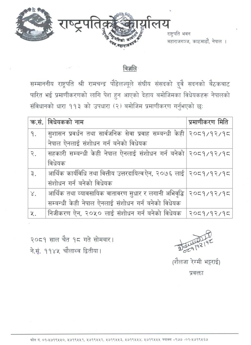 १८ चैत्र २०८१, काठमाडौं । राष्ट्रपति रामचन्द्र पौडेलले संघीय संसद्का दुवै सदनबाट पारित भई पेस भएका विभिन्न पाँचवटा विधेयक प्रमाणीकरण गरेका छन् ।
