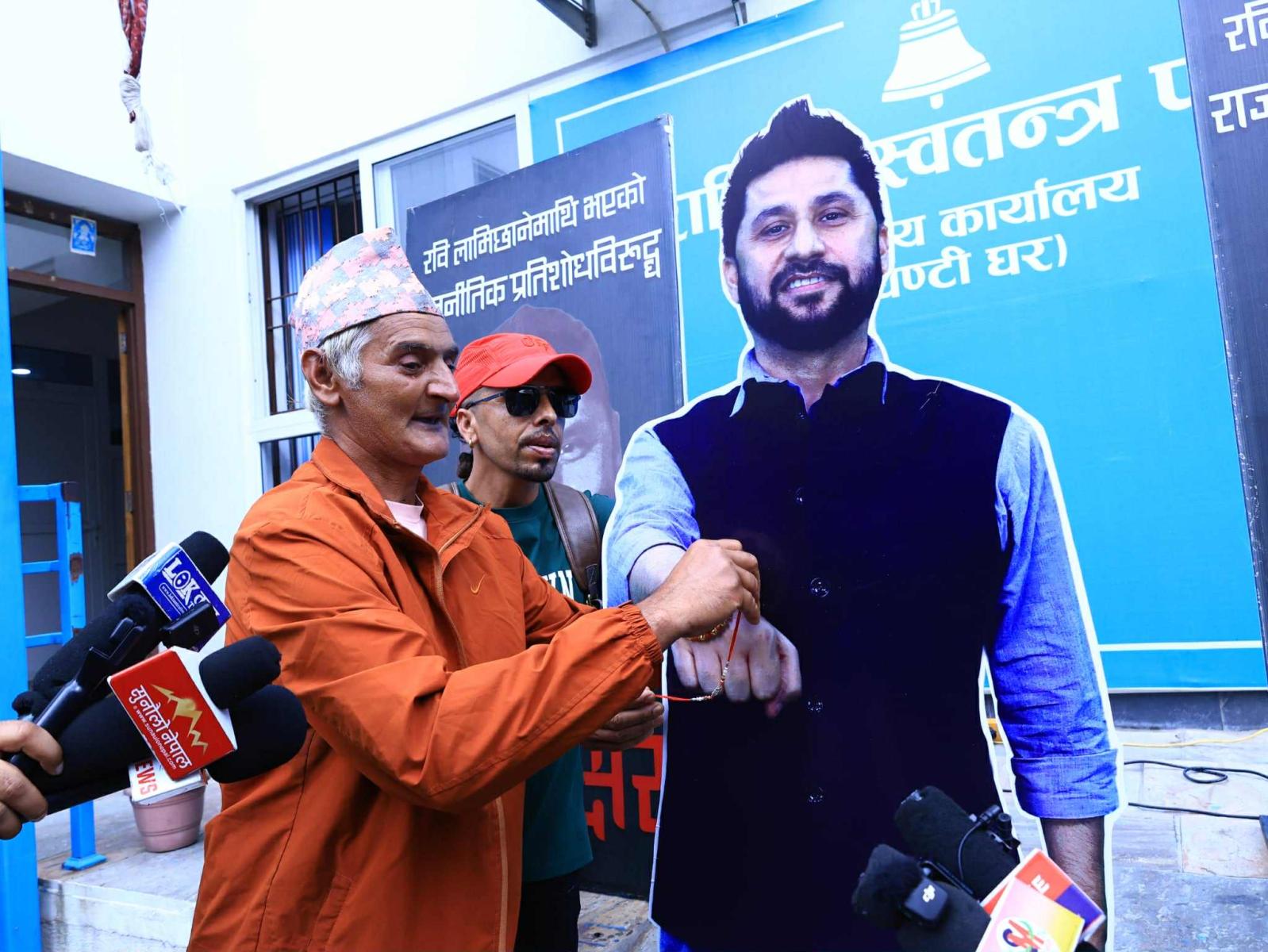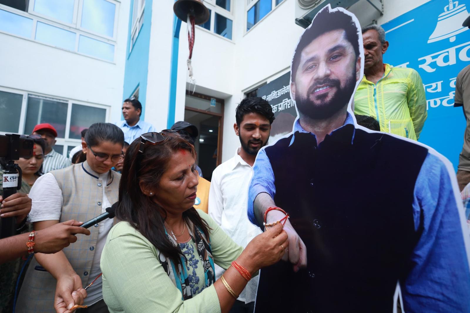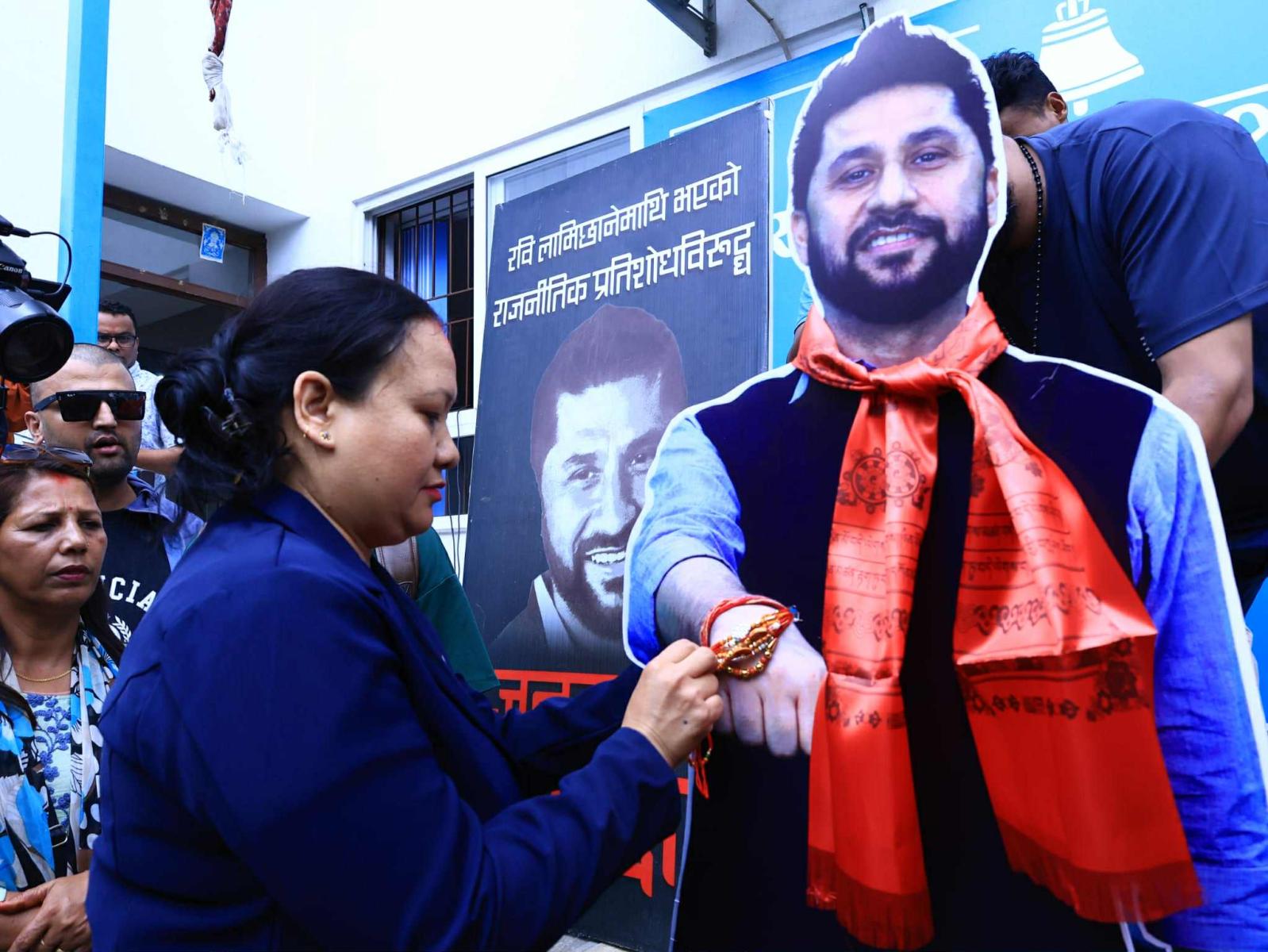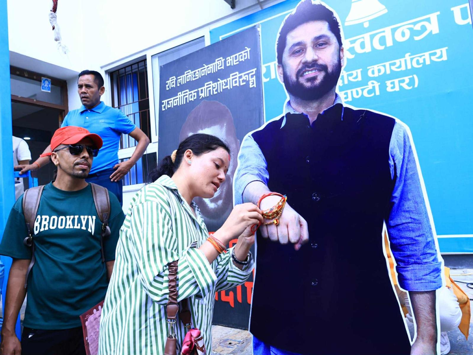 २०८२ साउन २४, काठमाडौं । राष्ट्रिय स्वतन्त्र पार्टीका सभापति रवि लामिछानेको कट आउटमा राखी बाँधेर उनका समर्थहरूले रक्षा बन्धन मनाएका छन् । शनिबार रविको कट आउट राखिएको घण्टी घरमा पुगेर उनका समर्थकहरूले राखी बाँधिदिएका हुन् ।