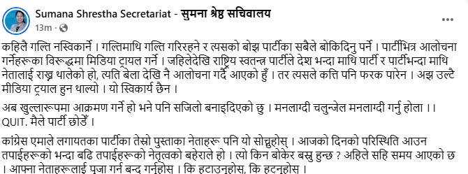 रास्वपा छोडेको जानकारी दिँदै उनले भनिन्,’ अब खुल्लारुपमा आक्रमण गर्ने हो भने पनि सजिलो बनाइदिएको छु । मनलाग्दी चलुन्जेल मनलाग्दी गर्नुहोला । मैले पार्टी छाँडे ।