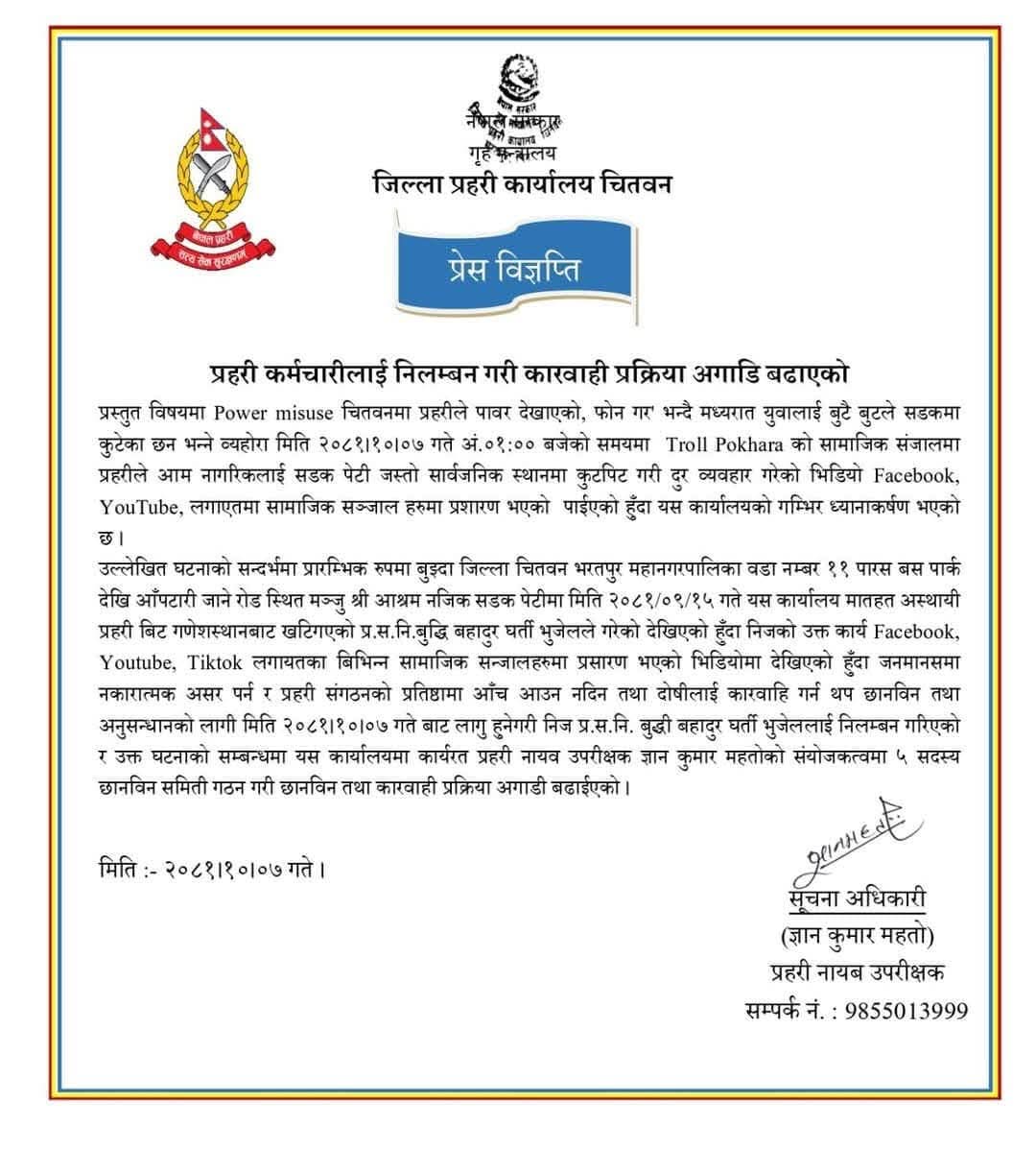 लगत्तै प्रहरीले उनलाई कारबाहीका लागि छानबिन समिति गठन गरेको छ। प्रहरी आचरणविपरीत काम गरेकाले निलम्बन गरिएको जिल्ला प्रहरी कार्यालय चितवनका एसपी गौतम मिश्रले जानकारी दिए ।