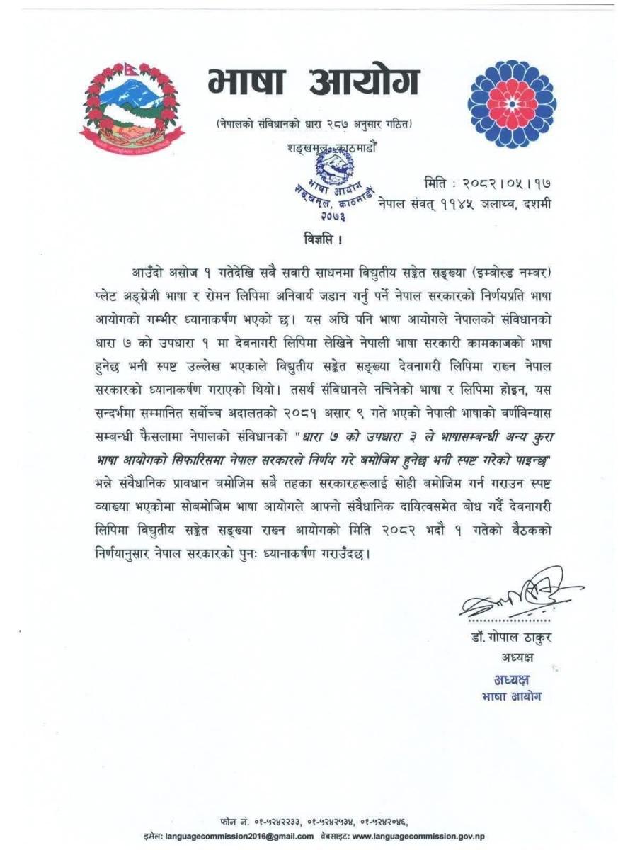 संविधानले नचिनेको भाषा र लिपीमा नभई नेपाली भाषामा नै इम्बोस्ड नम्बर प्लेट राख्नुपर्ने संवैधानिक व्यवस्था र सर्वोच्च अदालतको फैसलाको समेत आयोगले जानकारी गराएको छ ।
