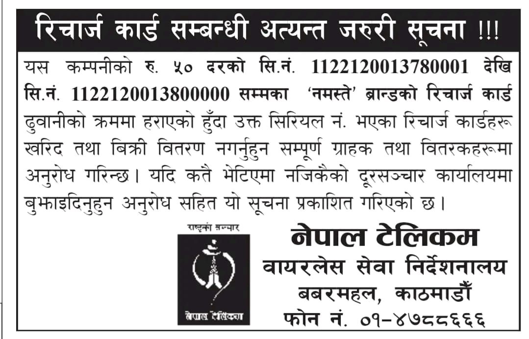 काठमाडौंबाट भैरहवा पठाउने क्रममा नमस्ते ब्राण्डका रिचार्ज कार्ड हराएको नेपाल टेलिकमको वायरलेस सेवा निर्देशनालय बबरमहलले जनाएको छ ।निर्देशनालयले आज सार्वजनिक सूचना जारी गरी ती रिचार्ज कार्ड फेला पारेमा नजिकको दूरसञ्चार कार्यालयमा बुझाइदिन वितरक वा ग्राहकलाई अनुरोध गरेको छ ।निर्देशनालयका अनुसार सिरियल नम्बर ११२२१२००१३७८०००१ देखि ११२२१२००१३८००००० सम्मका २० हजार थान रिचार्ज कार्ड हराएको सूचना दिएको हो ।