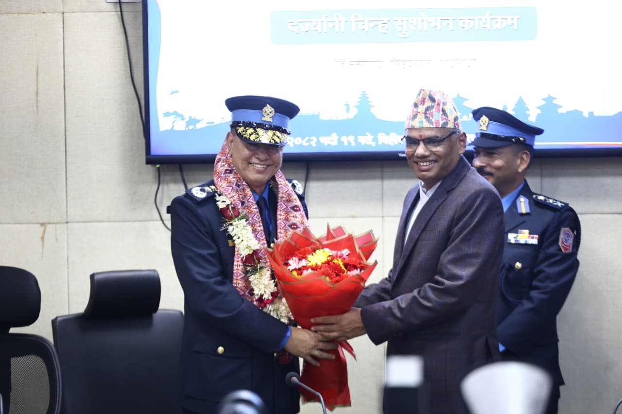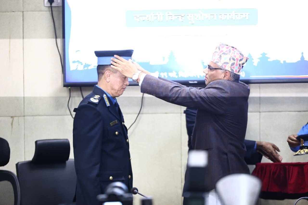 २०८२ भदौ १९, काठमाडौँ । नेपाल प्रहरीका नवनियुक्त महानिरीक्षक (आईजीपी) चन्द्रकुवेर खापुङलाई दर्ज्यानी चिह्न प्रदान गरिएको छ । गृह मन्त्रालयमा बिहीबार आयोजित समारोहमा गृह सचिव गोकर्णमणि दुवाडीले खापुङलाई दर्ज्यानी चिह्न लगाइदिएका हुन् ।