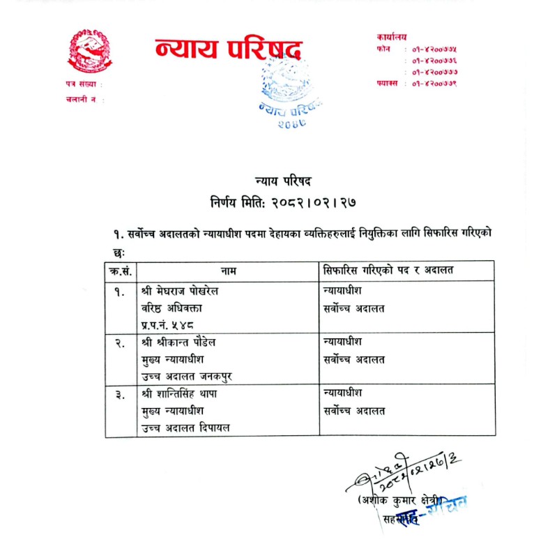वरिष्ठ अधिवक्ता मेघराज पोखरेल, उच्च अदालत जनकपुरका मुख्य न्यायाधीश श्रीकान्त पौडेल, उच्च अदालत दिपायलका मुख्य न्यायाधीश शान्तिसिंह थापाको नाम सिफारिस गरिएको परिषद्का सचिव यमबहादुर बुढामगरले डिसी नेपाललाई जानकारी दिए ।