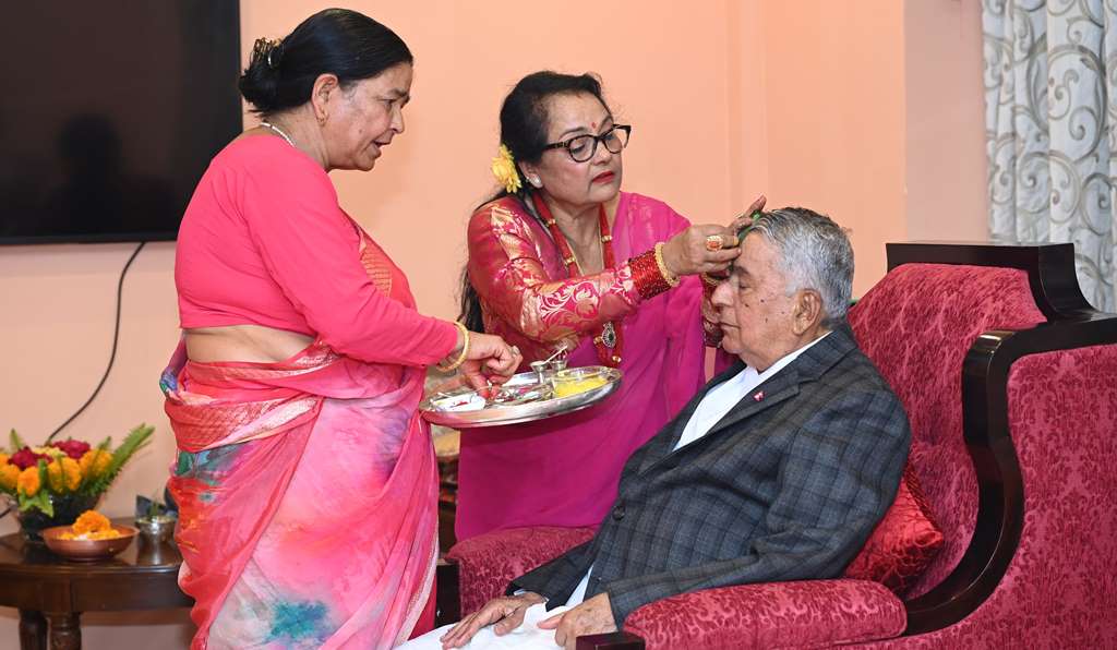 राष्ट्रपति भवनमा राष्ट्रपति रामचन्द्र पौडेललाई बहिनीहरू शारदा पण्डित र चन्दा ओझाबाट ११ बजेर ३७ मिनेटको शुभसाइतमा विधिपूर्वक तिहारको टीका लगाइदिएका हुन् । राष्ट्रपतिले पनि बहिनीहरूलाई आत्मीयताका साथ टीका लगाएर दक्षिणा दिएको राष्ट्रपतिको स्वकीय सचिवालयले जनाएको छ ।