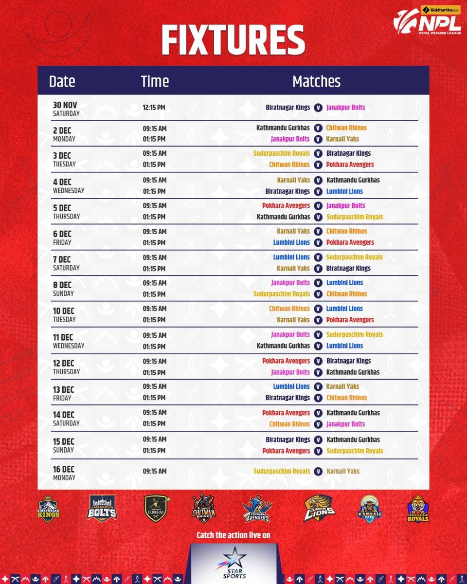 नेपाल क्रीकेट संघ (क्यान) ले सोमबार एनपिएलको खेल तालिका सार्वजनिक गरेको हो । तालिकाअनुसार १५ मंसिरको उद्घाटन खेलमा विराटनगर किङ्ग्स र जनकपुर बोल्टको खेल हुनेछ ।