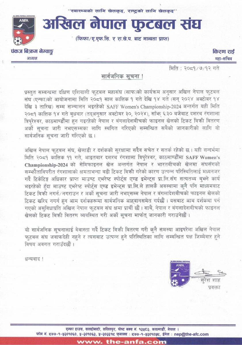 काठमाडौं, कार्तिक १२ । अखिल नेपाल फुटबल संघ (एन्फा) ले बुधबार हुने नेपाल र बंगलादेशबीचको साफ महिला च्याम्पियनसिपको टिकट बिक्रि बन्द गरेको छ ।