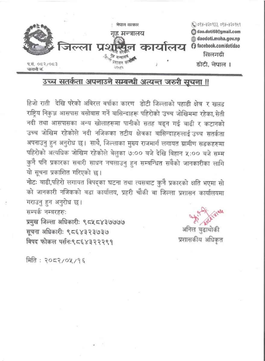 जिल्ला प्रशासन कार्यालय बैतडीद्वारा उच्च सतर्कता अपनाउन आग्रह